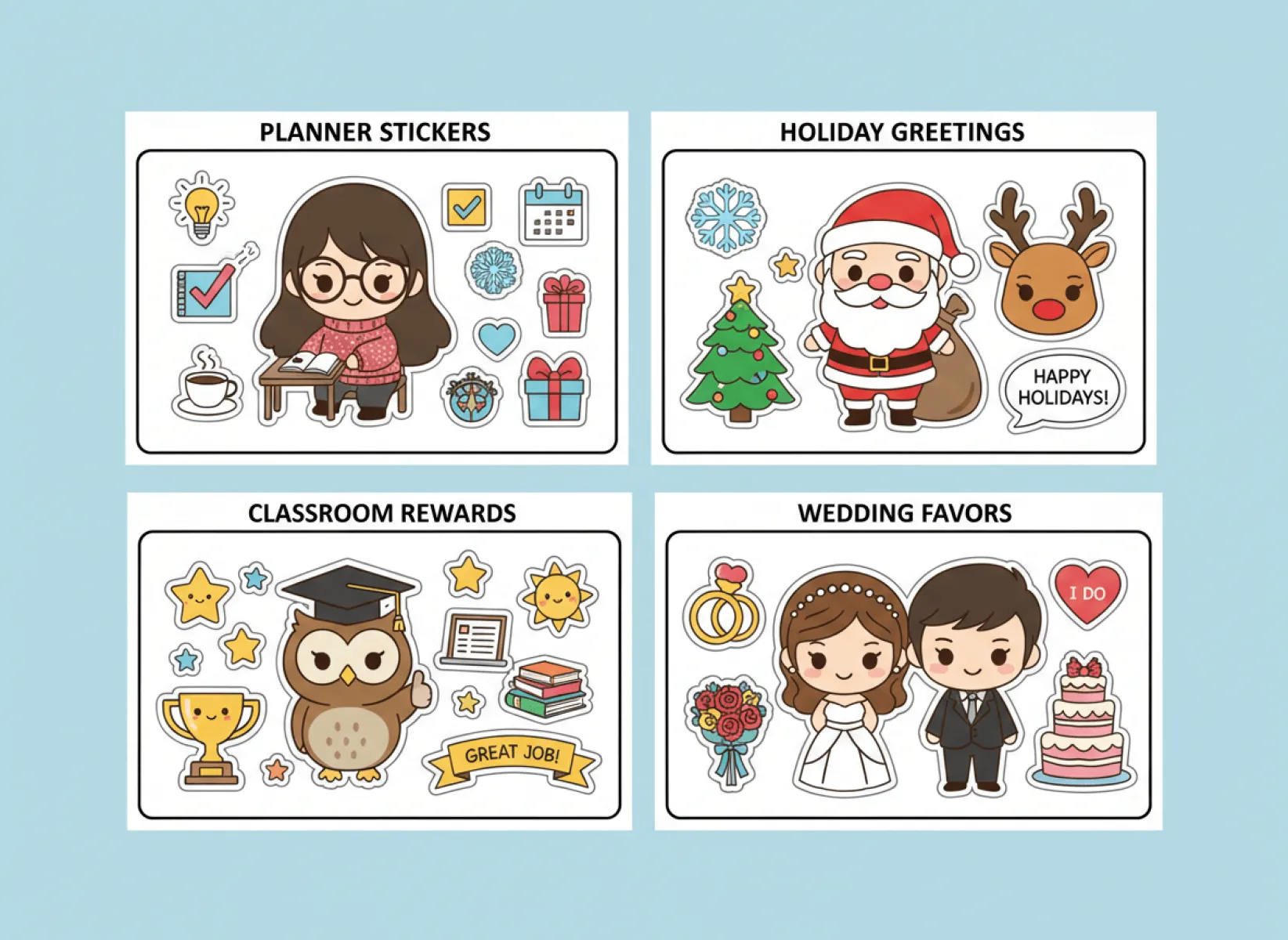 For example, wedding and party planners can use it to generate exclusive wedding and party stickers for invitations, on-site decoration and souvenir packaging, creating an exclusive ritual sense. Such as for weddings: generating *"romantic rose, heart and wedding dress stickers paired with the couple's names, gentle and romantic"*; for parties: generating *"cool and lively stickers paired with the party theme to enhance the on-site atmosphere"*.