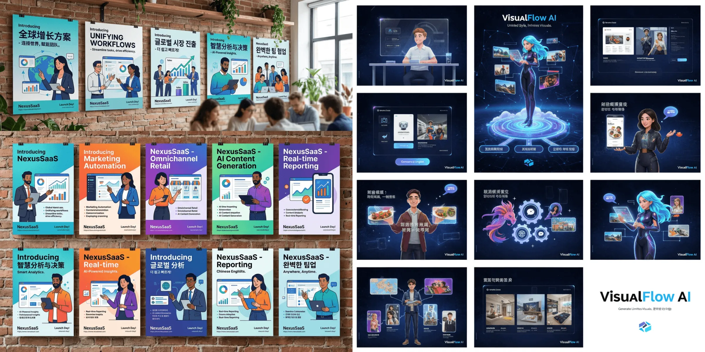 Example: SaaS product launch posters — generate 15 customer promotional images and multi-version advertising visuals with different key designs and a unified character style, supporting the rendering of Chinese, English, Korean, and other languages, with a highly consistent brand style.