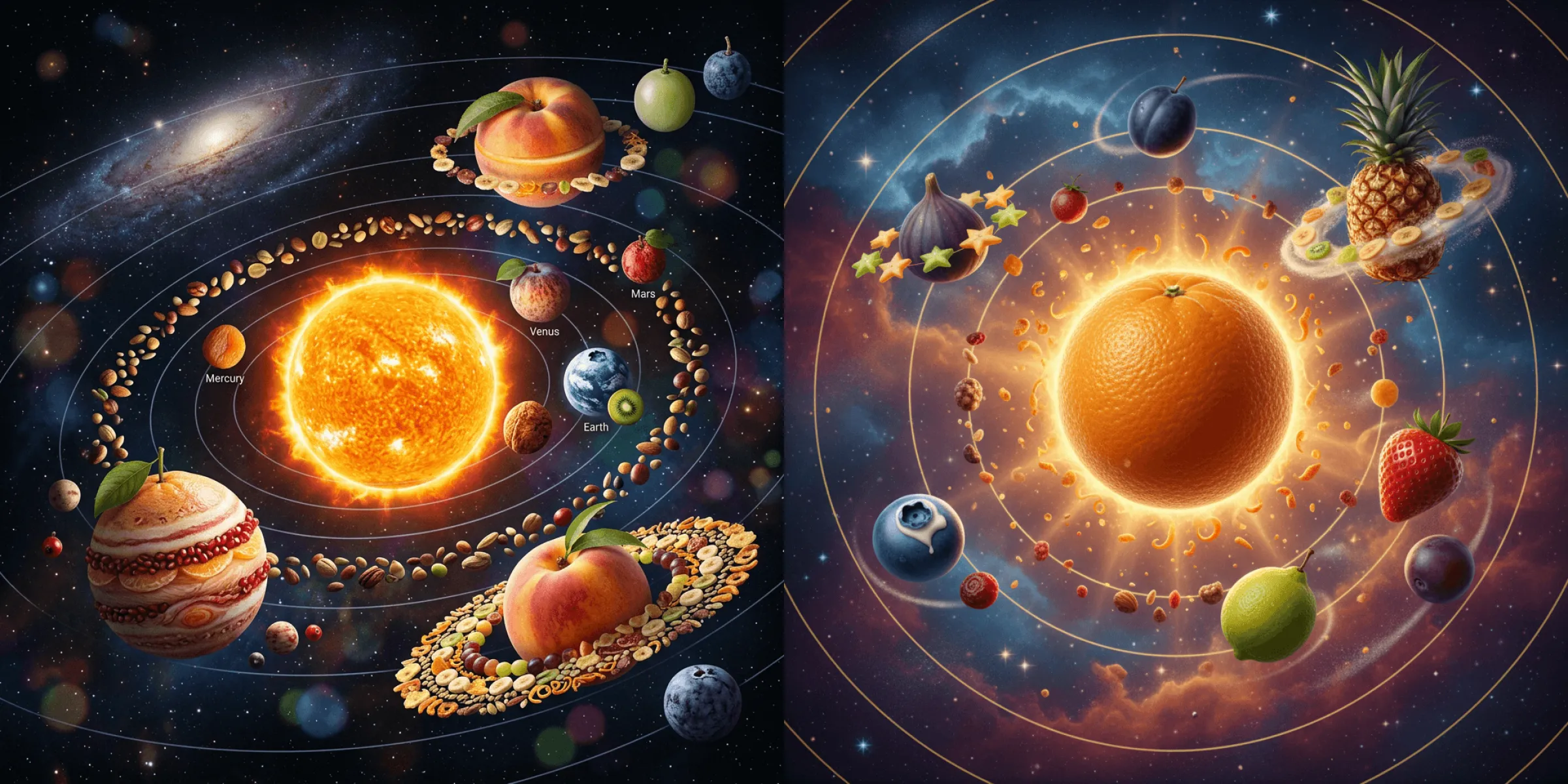 Example: Concept map of A Solar System Composed of Fruits — precisely restores the orbital structure with reasonably matched fruit characteristics (an orange as the sun, blueberries as the Earth, etc.), rich layers of light and shadow, intricate details, and full compliance with physical logic.