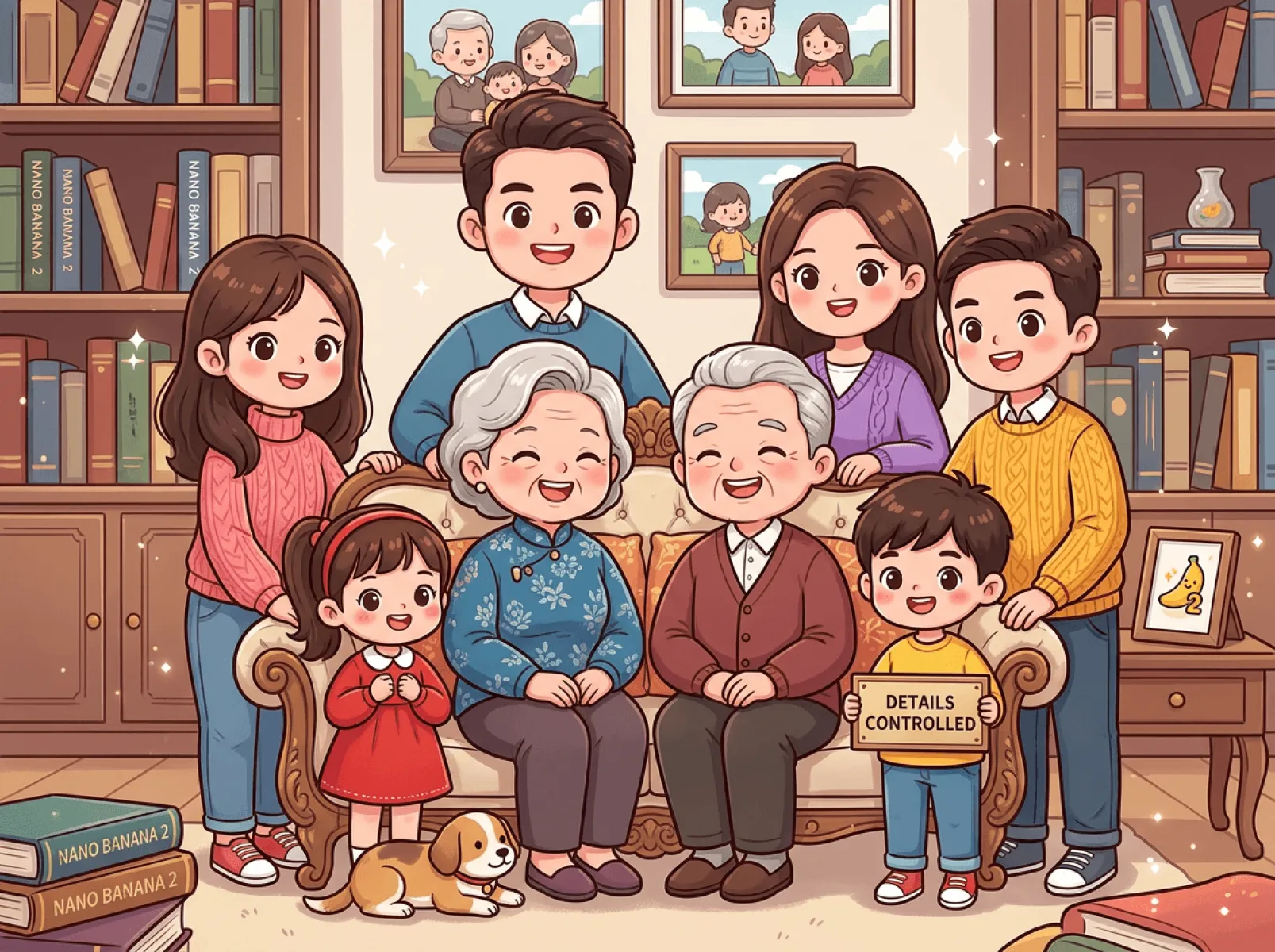 More notably, Nano Banana 2 delivers powerful detail fidelity, stably preserving facial consistency for up to 5 characters and the precise appearance of 14 objects in a single generation. This feature completely solves the problem of "inconsistent multi-character results" in traditional generators. For example, when generating a set of family portraits, users can ensure consistent features and styles across all family members without repeated prompt adjustments. When creating a series of illustrations, the protagonist’s appearance and style remain consistent across images, greatly reducing the difficulty of multi-scene and multi-character creation—ideal for brand IP building, series illustrations, children’s picture books, and more.