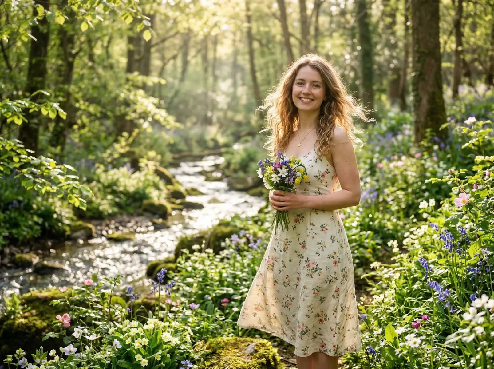 You will quickly generate a spring portrait that meets your expectations and is rich in detail, perfectly reproducing the spring forest and character texture described in your prompt.