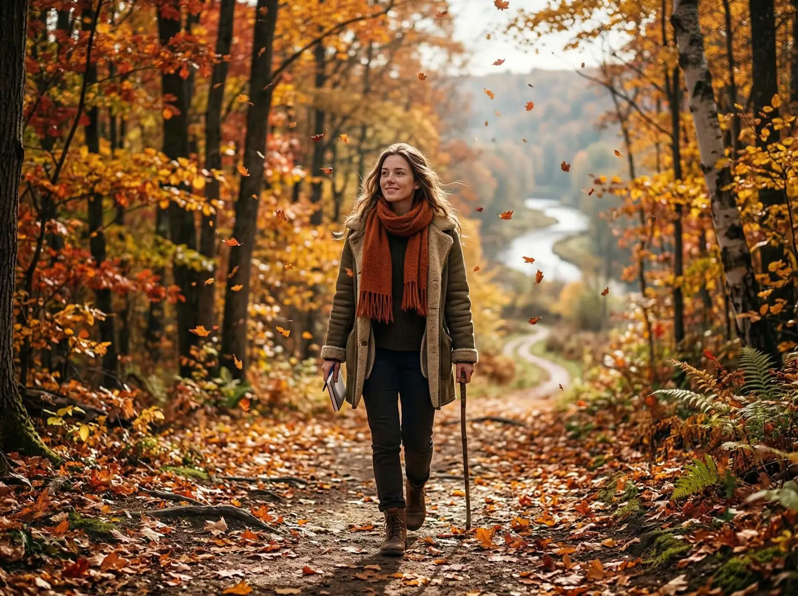 Realistic portrait of a young woman walking elegantly in a golden autumn forest. Red maple and yellow leaves drift slowly in the air. Her skin and hair details are intricate and realistic, and her facial expression is natural and relaxed. A warm, textured scarf and soft coat fit her figure perfectly. Soft sunlight casts transparent light and shadow on the ground. The background features a flowing stream and misty trees, paired with stunning autumn-exclusive color combinations, cinematic depth of field, and subtle atmospheric perspective. Ultra-high-definition output, rich texture, and multi-style fusion. AI-assisted adjustment of composition, pose, and scene elements. Ideal for emotional narration, digital illustration, seasonal art creation, and character concept design.