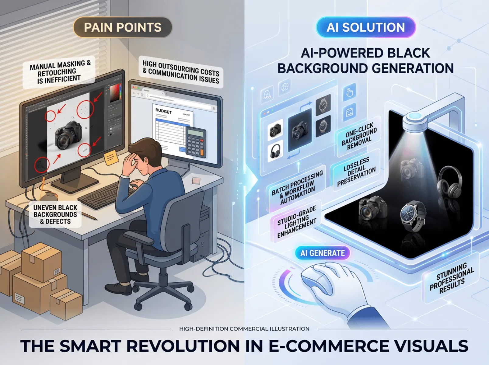 E-commerce has much higher requirements for the standardization and texture of product images than offline displays. The core current situation of black-background image production focuses on three dimensions: traffic conversion, production efficiency, and cost control. Traditional solutions only treat the symptoms but not the root cause, directly affecting store revenue and core competitiveness.