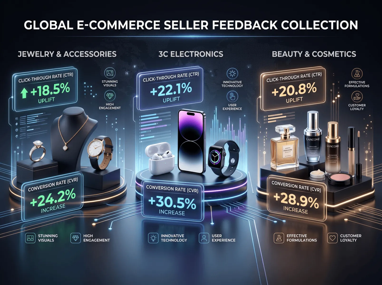 E-commerce platform traffic distribution relies heavily on main image CTR and user stay time. High-end black-background images can quickly attract consumers' attention with their advantages of high contrast, strong texture, and high recognition. However, most black-background images produced by merchants have obvious flaws: insufficient purity of the black background with mixed color textures, which looks cheap and fails to convey a high-end tone; rough product edges with residual white borders and blurred details of transparent materials; lack of professional light and shadow design, resulting in a flat presentation of products, which greatly reduces buyers' trust. Such low-quality black-background images directly lead to a CTR 30%-40% lower than that of competitors. Even if ads are launched to acquire traffic, the conversion rate will drop by 20%-30%, and the advertising ROI will continue to decline, seriously hindering market expansion.