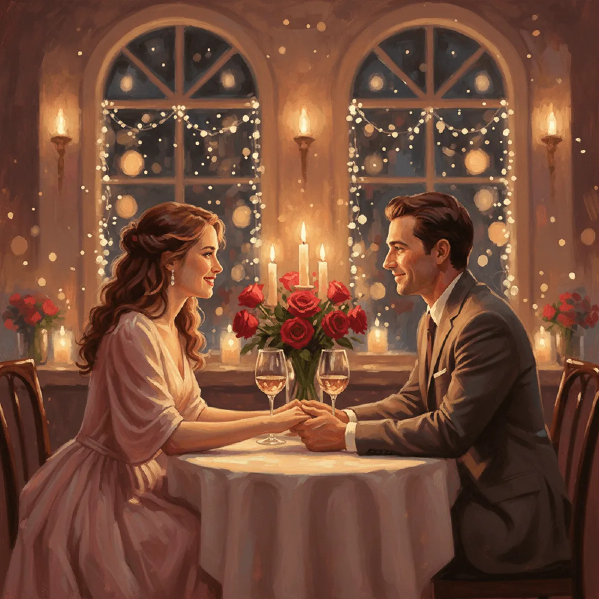 “Valentine’s Day romantic atmosphere scene, a candlelit restaurant with red roses and crystal glasses on the table, a couple holding hands and smiling at each other, warm yellow lights and subtle starlight in the background, soft oil painting style, gentle pink-orange color palette, high resolution, clear details, cinematic atmosphere composition.”
