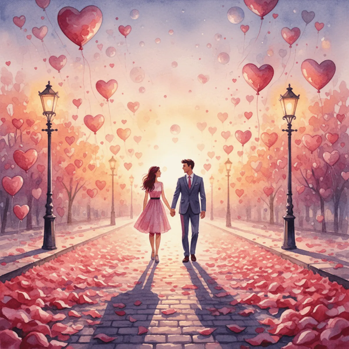 “Valentine’s Day romantic street atmosphere, a couple walking hand in hand on a street covered with pink flower petals, gentle sunset glow forming a soft halo, warm streetlights, floating balloons in the background, watercolor style, cinematic composition, 8K resolution, sweetness overload.”