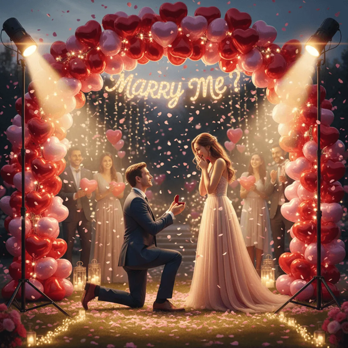 “Valentine’s Day surprise confession scene, a heart-shaped balloon and light-strip arch, the man kneeling on one knee presenting a diamond ring, the woman smiling with tears in her eyes, pink petals falling around them, warm light focused on the couple, a scene full of emotion and excitement, extremely rich details, delicate lighting.”