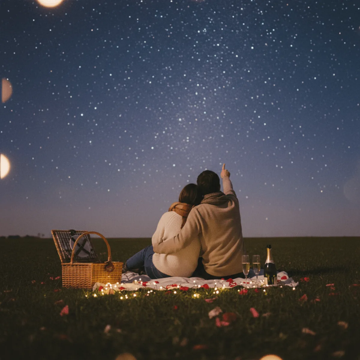 “Valentine’s Day romantic atmosphere under the starry sky, a picnic blanket and champagne glasses on the lawn, a couple leaning together watching countless stars, scattered fairy lights and rose petals nearby, a blue-purple gradient night sky, vintage film style, high resolution, poetic and healing, full of atmosphere.”