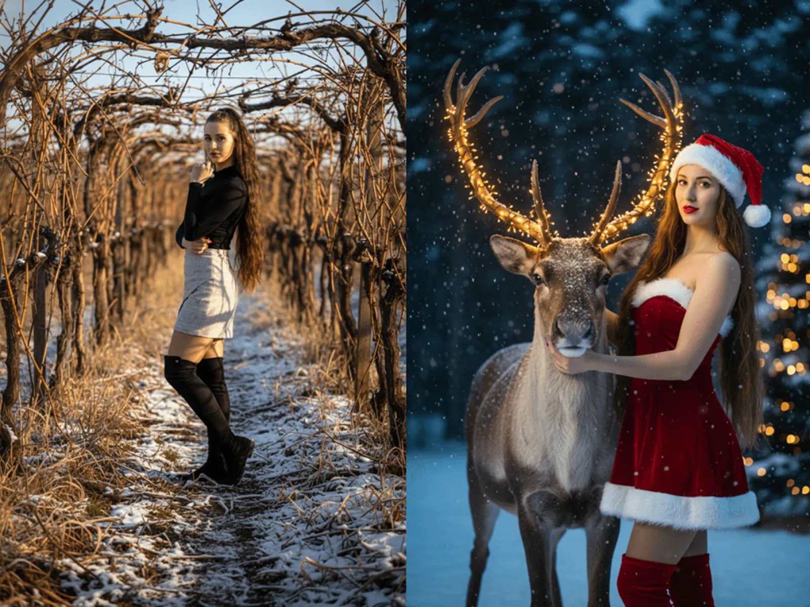 - Märchenhafte Rentier-Porträts:Elegante Kleider mit Schlitten, Schnee und Holzhütten – ideal für auffällige Profilbilder.