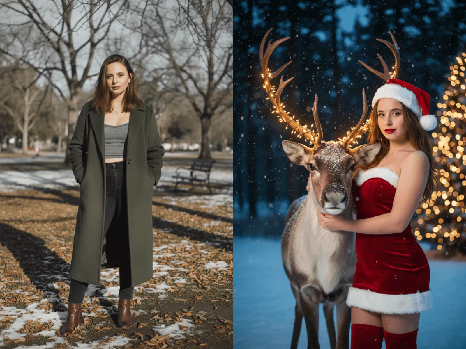 Die KI passt Weihnachtskleidung an Alter, Geschlecht und Ausstrahlung an – von eleganten Kleidern über kuschelige Rentierpullover bis hin zu klassischen Rot-Grün-Looks. Gesicht und Ausdruck bleiben vollständig erhalten und wirken authentisch.