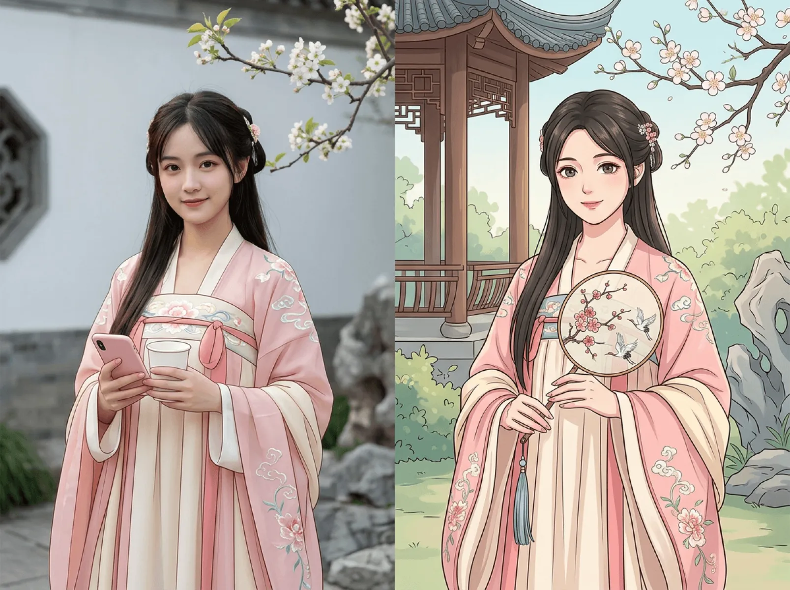 Dank der starken Auffassungsgabe von Anweisungen und dem Stiltransfer von Nano Banana 2 deckt der Fast Image AI-Cartoon-Generator Dutzende beliebter Stile ab: niedlicher Chibi, japanischer Anime, retro Handgemalt, minimalistisch flach, chinesischer Cartoon, westlicher Cartoon und mehr. Ob süße Mädchencartoons, coole Trendcartoons, liebevolle Tiercartoons oder elegante chinesische Cartoons – alles wird präzise dargestellt. Besonders wichtig ist die genaue Umsetzung von Anweisungen: Auch komplexe Stilbeschreibungen werden perfekt umgesetzt. Beispielsweise generiert die Eingabe: „Niedliche Chibi-Figur in chinesischem Stil, in Hanfu, mit Fächer, Hintergrund im alten chinesischen Garten, frische sanfte Farben, runde klare Linien“ jedes Detail genau und entspricht damit voll und ganz den Vorstellungen des Nutzers.