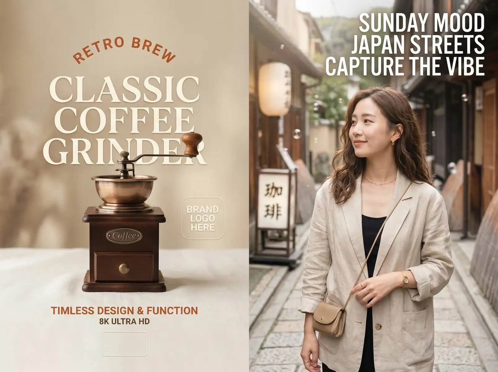 8K Ultra HD, Doppelte Textur aus Vintage-Produktplakat und INS-Porträt. Vintage-Plakat mit sanften Filtern, detailreich verfeinert, sauberer einfarbiger Hintergrund, reservierter Platz für das Markenlogo, edle Textur und warme Töne. INS-Porträt mit Hintergrundwechsel zur japanischen Straße, optimierter Lichtführung, natürlicher Hautglättung, durchsichtige Töne und sanfte Lichtflecken für eine starke Atmosphäre. Kompatibel mit intelligentem Hintergrundwechsel, Detailretusche und weiteren Funktionen. Professionelle Ergebnisse mit nur einem Klick.