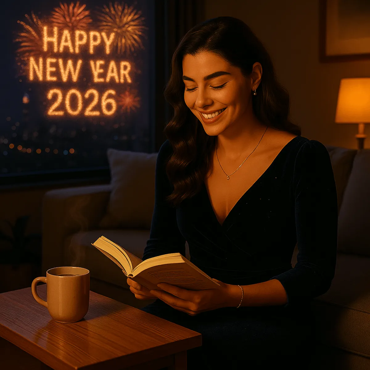 Der klassische Neujahrslook: Du verschmilzt mit funkelnden Feuerwerken und leuchtenden Städten – perfekt für den Countdown-Moment.