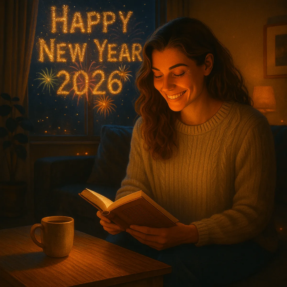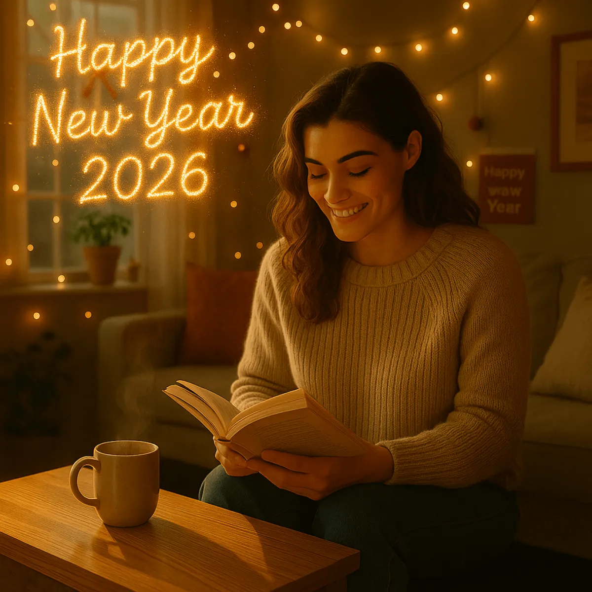 „Neujahrstag im Familienkreis: warmes Wohnzimmer, weiches Licht, lächelnde Familienmitglieder, festliche Dekoration.“