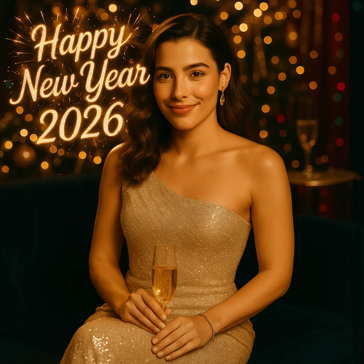„Luxuriöses Neujahrsporträt: elegante Couture-Abendrobe, goldene Festdekorationen, moderne Lichtstimmung, hochwertiger Fashion-Fotostil, hohe Auflösung.“