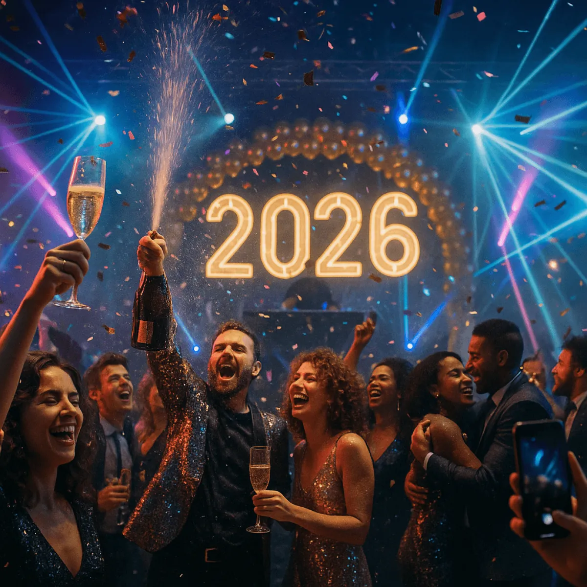„Menschen feiern Neujahr 2026, buntes Konfetti, Partybeleuchtung, fröhliche Atmosphäre, filmischer Stil, 8K-Auflösung“
