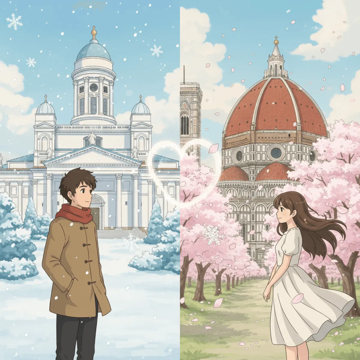 „Ein Fernbeziehungspaar im Cartoon-Stil, der Mann in einer nordischen Schneelandschaft mit dem Dom von Helsinki im Hintergrund, die Frau in einem südeuropäischen Kirschblütenwald mit der Kathedrale Santa Maria del Fiore in Florenz, leuchtende herzförmige Lichtstrahlen verbinden beide, Schnee und Kirschblüten fallen gemeinsam, warmer heilender Ghibli-Animationsstil, warme Farbtöne, 8K-Auflösung, 16:9-Format, hochdetailliert.“