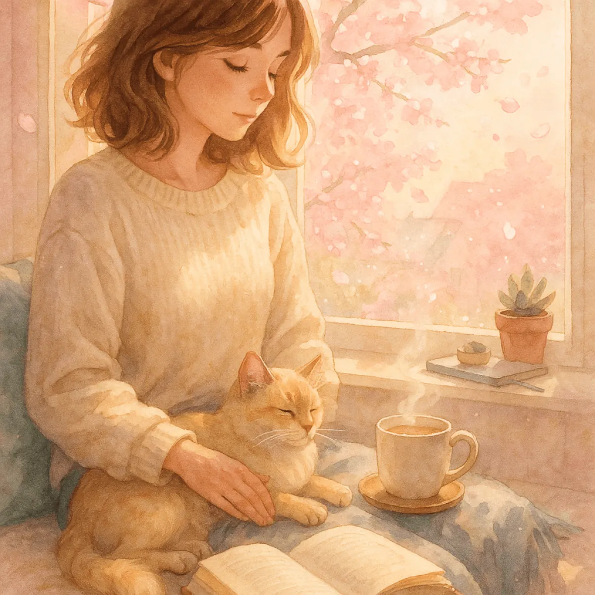 „Eine Frau genießt ihre Zeit allein, trägt einen gemütlichen Strickpullover, sitzt am sonnigen Fensterplatz, ein offenes Buch und warme Milchtee neben ihr, eine schläfrige Katze liegt auf ihren Beinen, draußen Kirschblütenbäume, heilender Aquarellstil, rosafarbene Töne, 4K-Auflösung, 9:16-Format, luftige klare Bildwirkung.“