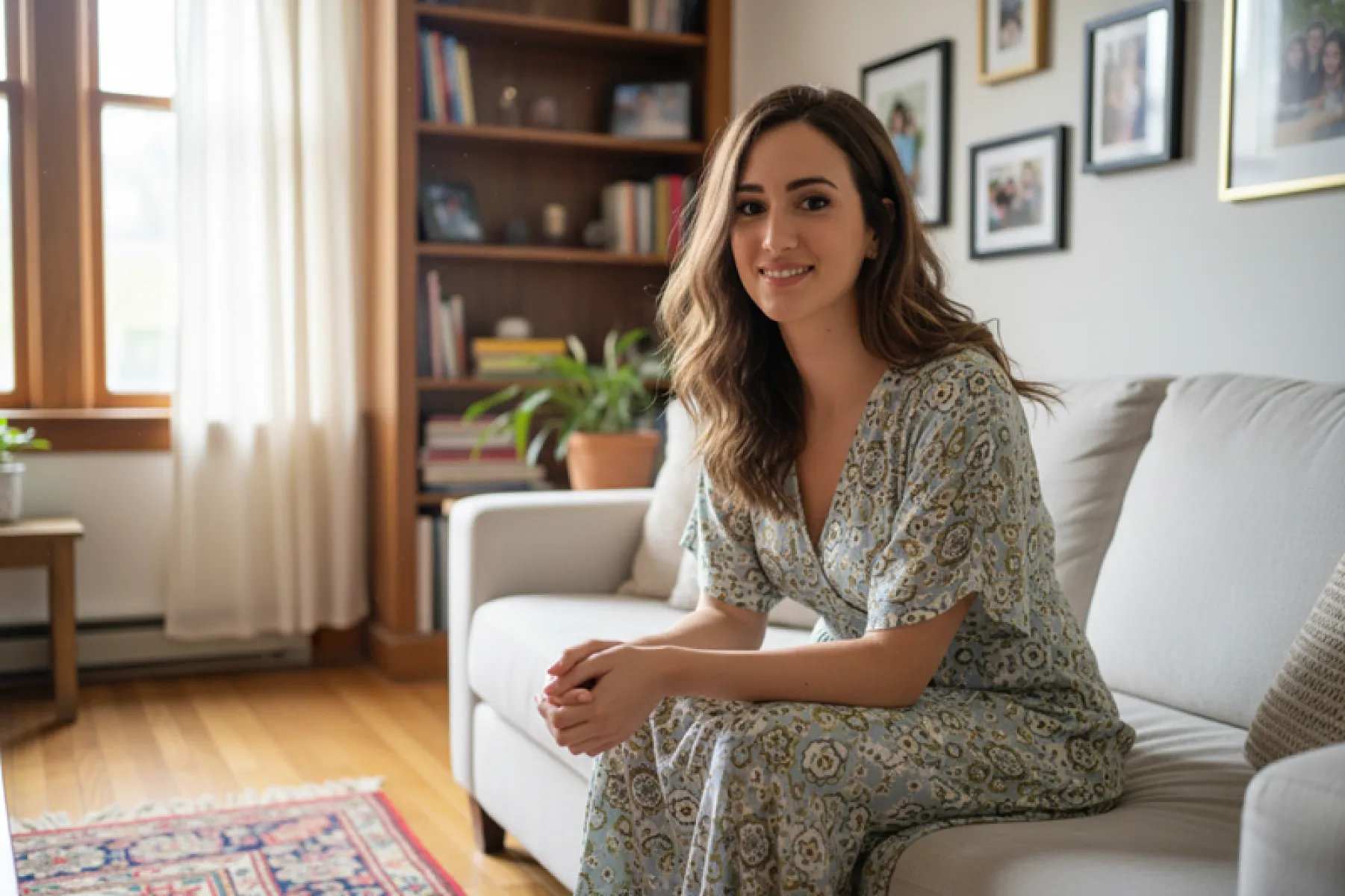 „Die Person in eine nostalgische Weihnachts-Wohnszene integrieren. Vintage-Holzmöbel, Kamin mit Strümpfen, Kerzenlicht und warme Beleuchtung, klassische Christbaum-Dekorationen, warme nostalgische Farbtöne, eine gemütliche, romantische und filmartige Weihnachtsatmosphäre.“