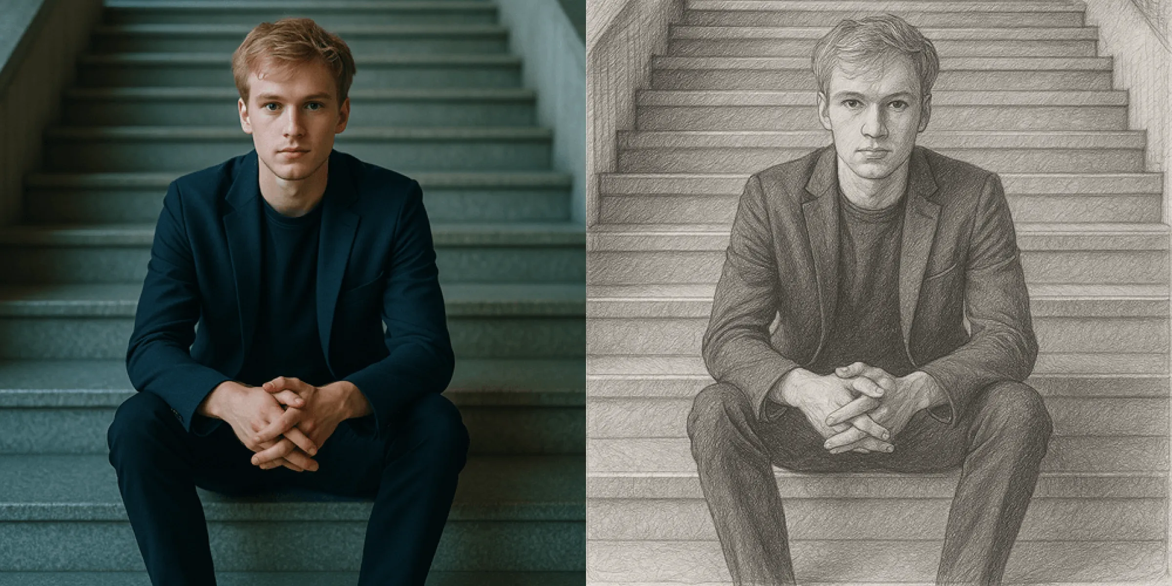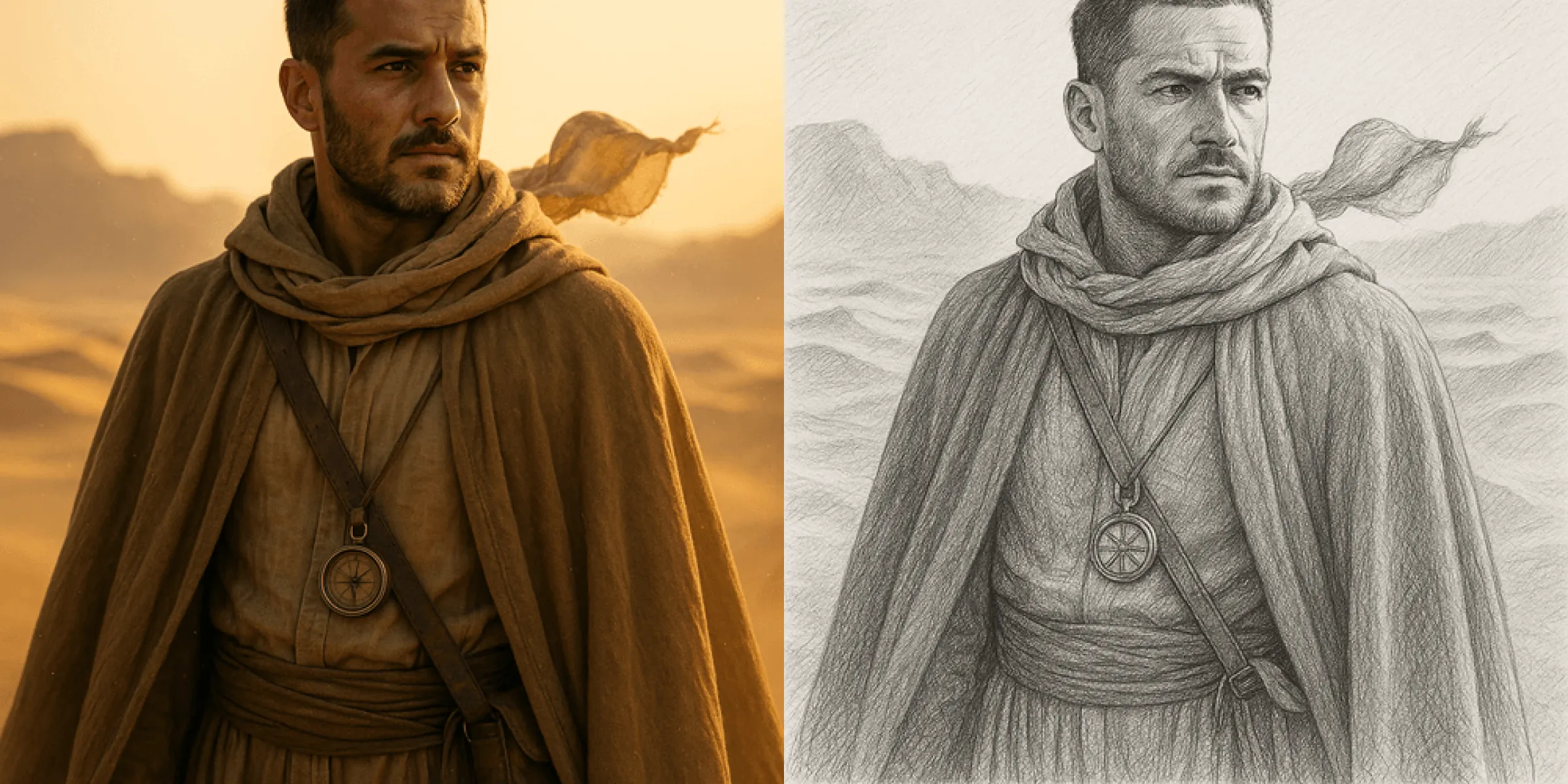素描并不仅仅是把照片变成黑白——它是一种充满表现力的艺术效果,可以让你的照片看起来更干净、更有情绪,也更像一幅真正的手绘作品。而在 Fast Image AI 中,你只需要一张照片和一个简单的提示。上传,转换成素描,完成。