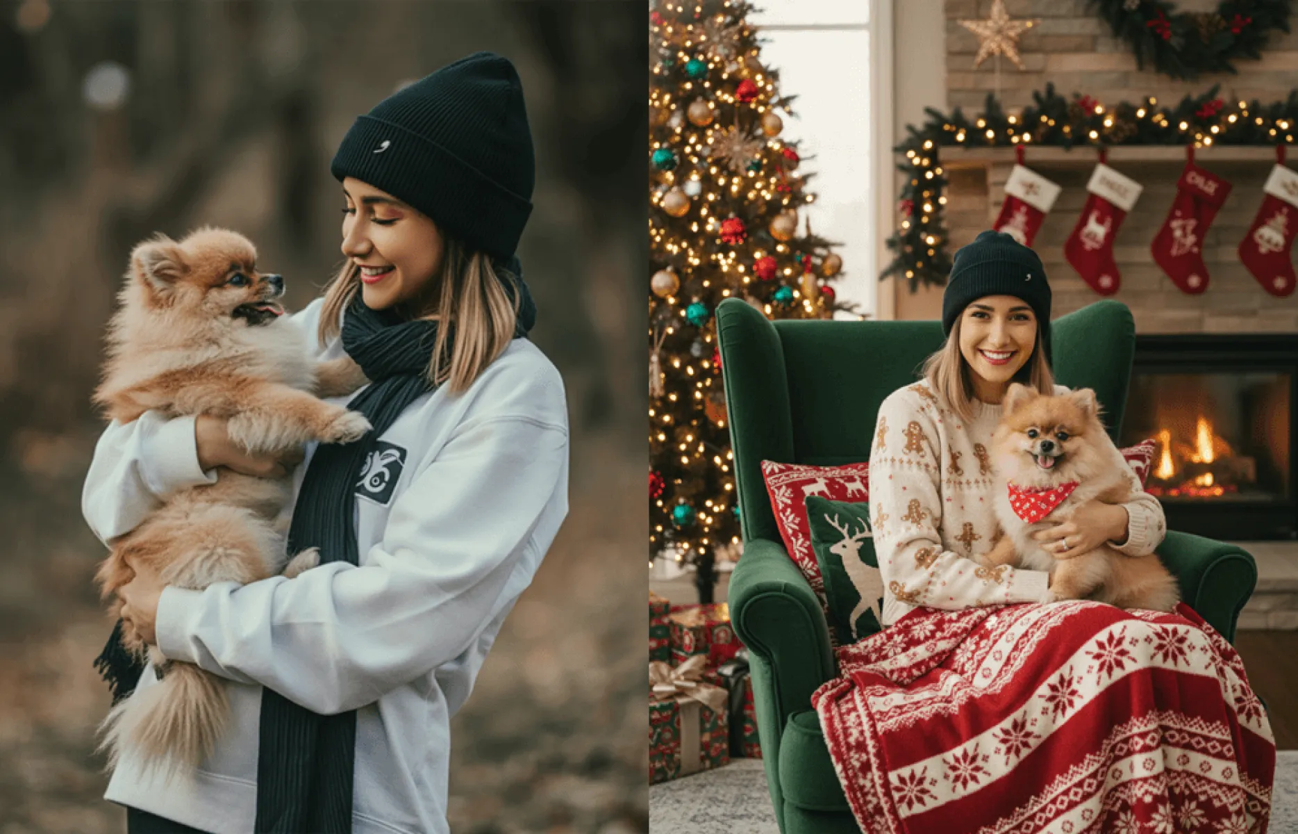 无需费心为宠物挑选服饰,AI会根据人物风格与宠物品种,自动匹配适配的圣诞主题着装与配饰。无论是主人的圣诞毛衣、鹿角发箍,还是宠物的圣诞小披风、铃铛项圈,都风格统一、质感细腻,仿佛精心搭配的亲子套装,尽显温馨互动感。