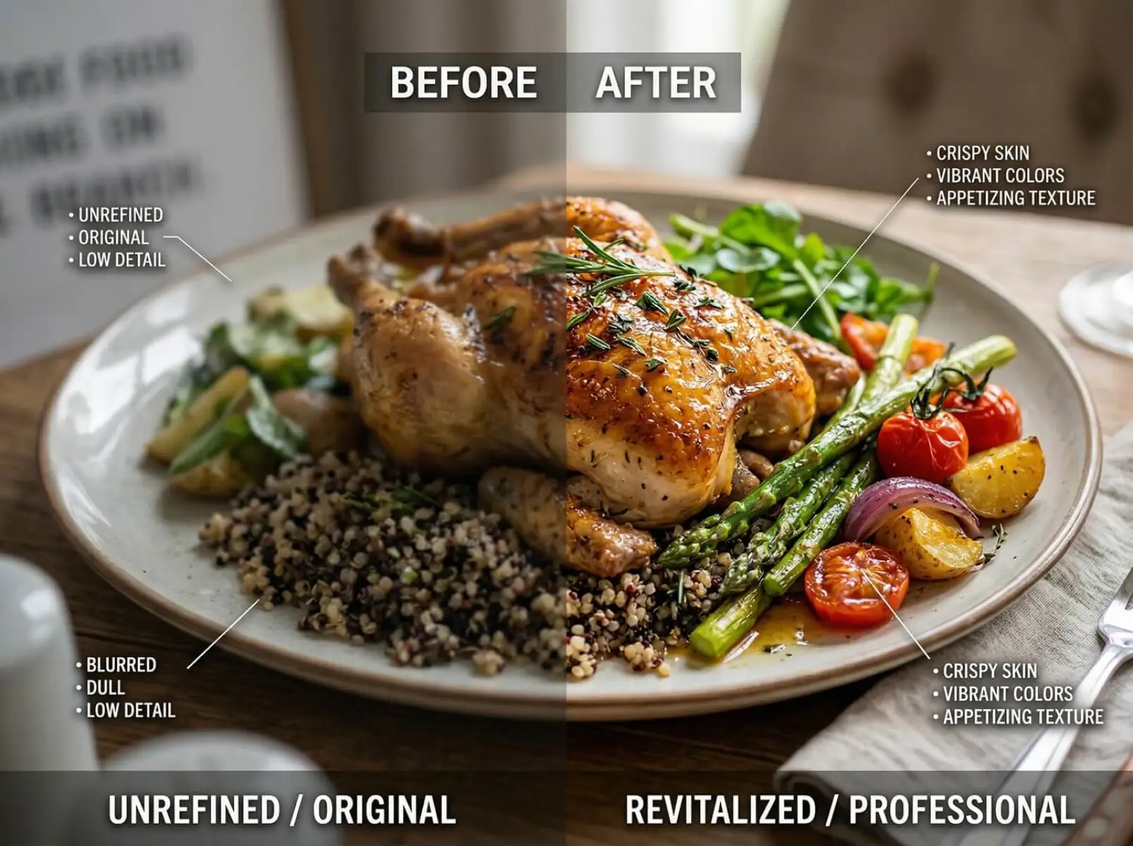 - 美食摄影:精准还原食物本真色彩,针对性提升食物的光泽度与质感,让菜肴自带“食欲感”。智能优化食物色彩,还原食材本身的鲜活色调,避免色彩暗沉、失真,同时强化食物纹理,清晰呈现食材的鲜嫩、酥脆或细腻质感,弱化画面反光与杂色,让每一道菜肴都色泽诱人、质感饱满,无论是美食探店、菜谱分享,还是餐饮宣传图,都能快速抓住观众目光;