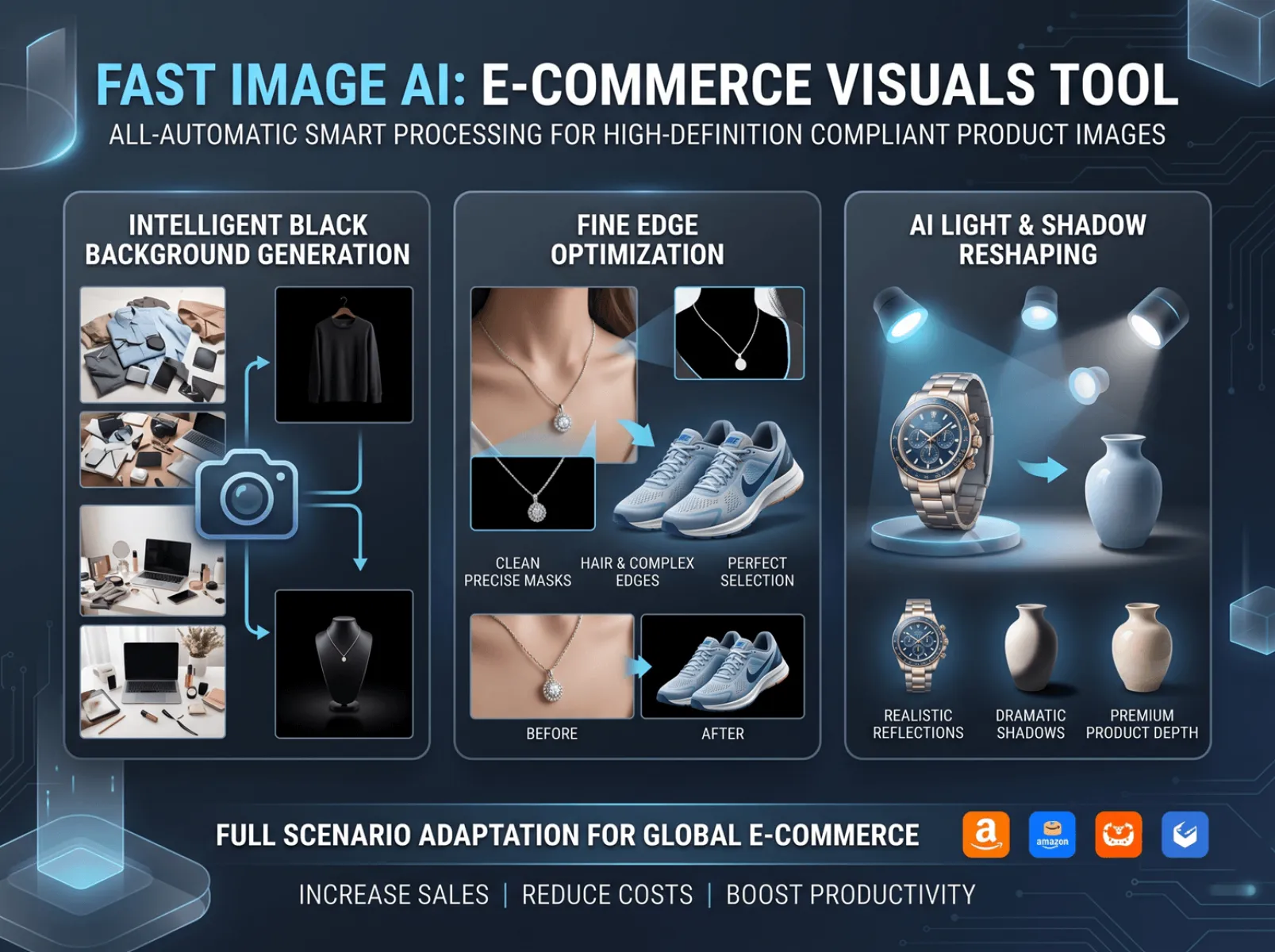 电商行业竞争日趋激烈,高级黑底商品图是打通流量、提升转化、塑造品牌形象的关键,传统制作模式存在高成本、低效率、质感差的问题,难以适配当下的市场节奏。Fast Image AI聚焦黑底图制作现状,以三大核心能力打造零门槛、低成本、高效率的一站式解决方案,无需专业设备与外包服务,即可产出合规高品质黑底图,助力商家突破发展瓶颈、实现业绩提升。