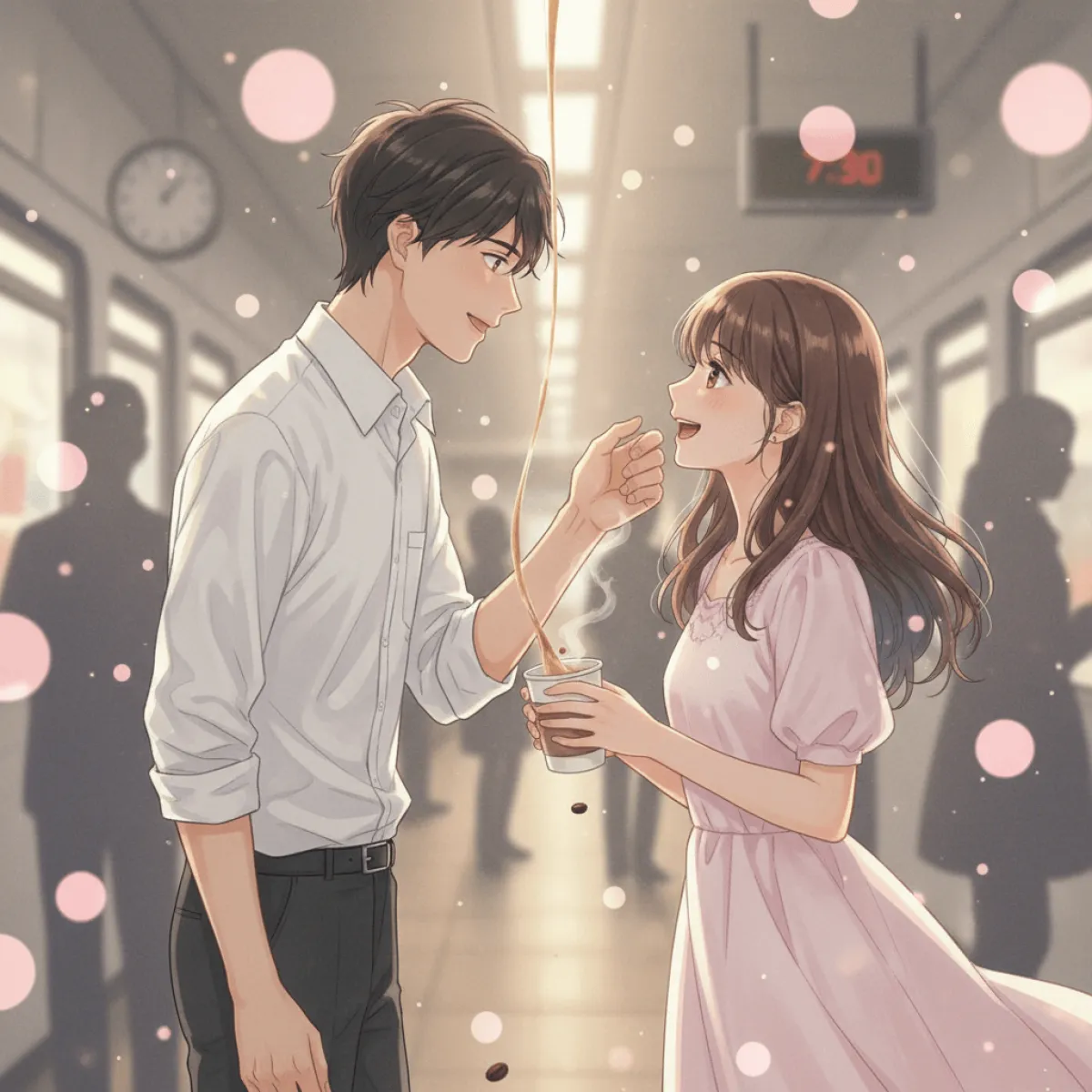 “一对年轻情侣,男生穿白衬衫,女生着浅粉连衣裙,复古地铁站台相遇,男生撞翻女生咖啡杯微倾,两人对视微笑,人群呈模糊剪影,粉色光斑浮动,日系清新插画风,电影级柔光,4K 分辨率,3:4 画幅,人物比例协调“。