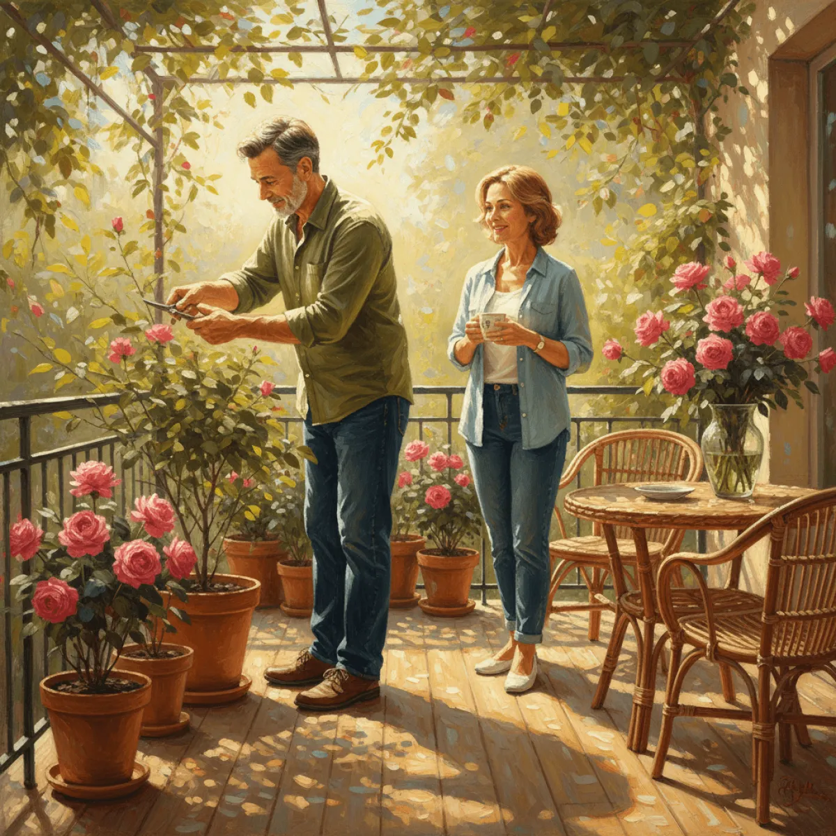 “一对中年夫妻,洒满阳光的阳台,丈夫为妻子修剪盆栽,妻子端热茶相伴微笑,阳台摆放月季与复古藤编桌椅,阳光形成柔和光斑,写实油画风,暖色调,8K 分辨率,1:1 画幅,高清纹理“。